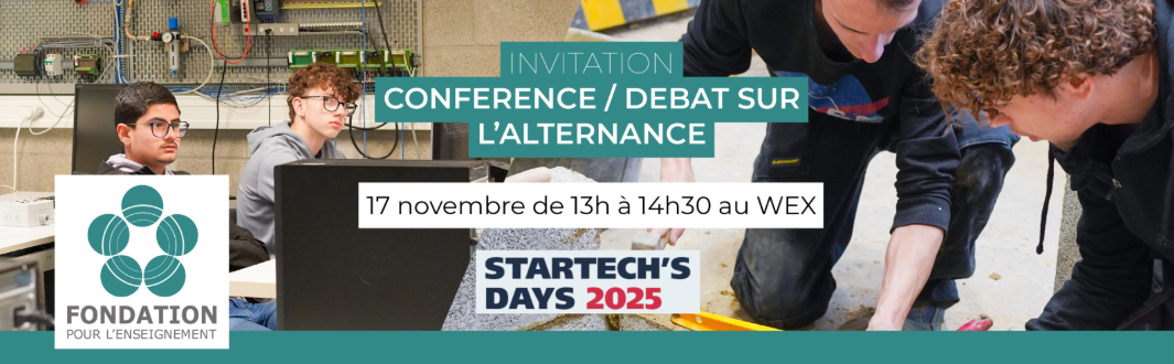 Le 17 novembre prochain, à l’occasion des Startech’s Days organisé par WorldSkills Belgium au WEX, la Fondation pour l'Enseignement vous invite à une rencontre-débat consacrée aux enjeux et aux perspectives de l’enseignement en alternance pour les jeunes.